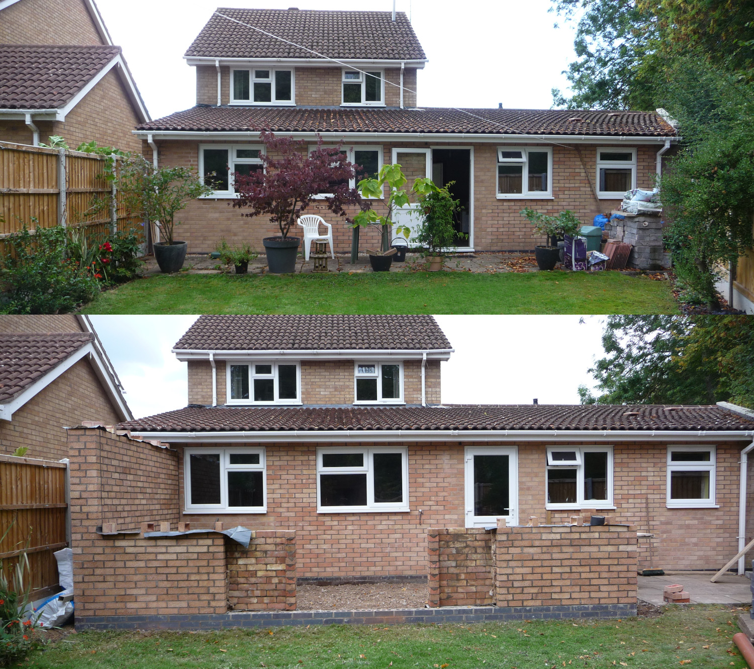 We received planning permission for the conservatory, which was needed as it will be built on the back of an extension to the original building, in early September, and the builders arrived to start work on Thursday the 18th. As of the time of writing the base of the conservatory is now almost complete, and should be finished off in the next day or two. The photo below shows the progress that has been made, compared with the original patio.